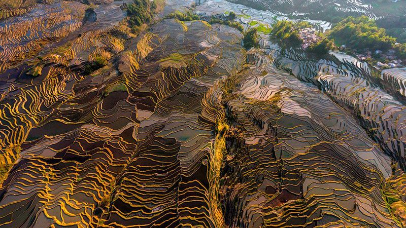 Pola ryżowe w Chinach, jak i całej Azji, to jedne z piękniejszych krajobrazów, które powstały dzięki ingerencji człowieka. Naukowcy, badający ślady uprawy roślin sprzed tysięcy lat w Państwie Środka, doszli do wniosku, że kultywacja ryżu na wielką skalę rozpoczęła się tam ponad 7700 lat temu. Dziś uprawy przyciągają miliony turystów, zachwyconych pięknem krajobrazu. Dzięki tarasom woda utrzymuje się na poletkach. Podczas zachodów słońca jej tafla zamienia się w lustro, w którym odbija się niebo. Za najpiękniejsze uchodzą pola w prowincji Junnan.