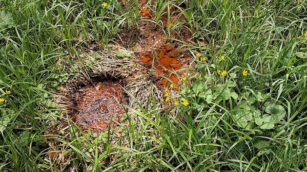 Na powierzchni wody wytrąca się charakterystyczny, rdzawopomidorowy osad nazywany ochrą czy potocznie "rudawką".