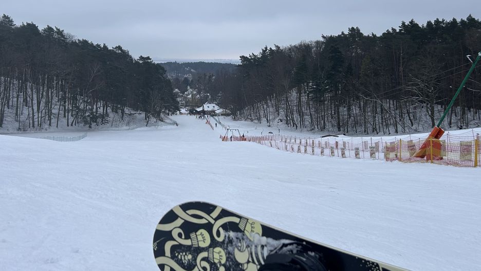 Ze szczytu w istocie rozciąga się całkiem przyjemna panorama miasta z wąskim przesmykiem, w którym spomiędzy drzew wyłania się fragment morza. Razem ze mną na stoku było kilku snowboardzistów. Reszta to narciarze. Większość z nich to mieszkańcy Trójmiasta.