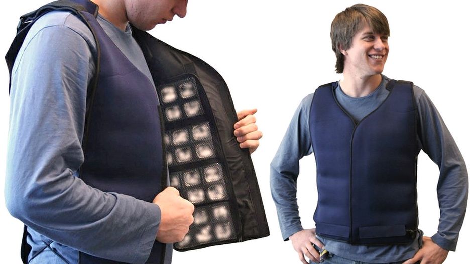 Co prawda w naszym kraju naprawdę ciepłych dni jest jak na lekarstwo, ale jeśli wybieracie się w gorętsze rejony globu, może zainteresuje was kamizelka Flexi Freeze Ice Vest. W tym ubraniu znajdują się za 3 panele z 96 żelowymi pakietami chłodzącymi. Po wyjęciu ich z lodówki i wpięciu do kamizelki możemy cieszyć się przyjemnych chłodem. Pomysł jest prosty i ciekawy, jednak moim zdaniem wygląd kamizelki wymaga dopracowania. Żadna szanująca się elegantka nie założy brzydkiego ubrania, które w dodatku pogrubia.