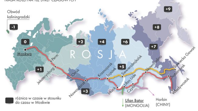 Kolej Transsyberyjska przebiega przez 8 stref czasowych, a jej całkowita długość wynosi prawie 9300 km. Jej główny szlak prowadzi z Moskwy *do *Władywostoku przez m.in. takie miasta jak Niżny Nowogród, Krasnojarsk i Irkuck. Pomysłodawcą jej budowy był Aleksander III, który w 1886 r. głośno mówił o potrzebie stworzenia _ Wielkiej Syberyjskiej Drogi _. Miała ułatwić komunikację pomiędzy oddalonymi od siebie o tysiące kilometrów miastami oraz przyspieszyć rozwój gospodarczy. Rok później wyruszyły trzy ekspedycje badawcze do wyznaczenia przebiegu trasy, a kilka lat później zaczęto prace nad pierwszym odcinkiem prowadzącym z Władywostoku do Czelabińska.