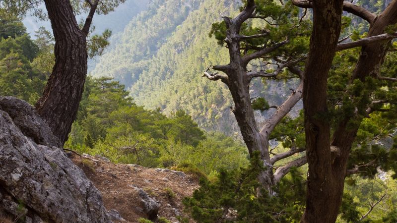 Pierwsze metry są najtrudniejsze. Z wysokości 1235 m n.p.m. schodzi się po kamieniach, wystających z ziemi korzeniach, nierównych ziemnych „schodach”, ale w cieniu drzew: pinii, świerków, dębów, cyprysów, klonów. Już 300 m niżej jest pierwszy punkt postojowy o nazwie Neroutsiko, 150 m niżej następny – Riza Sikias (są one oznaczone). Na wysokości 650 m n.p.m. stoi kaplica Agios Nikolaos (św. Mikołaja), jest tu ujęcie wody i toalety.