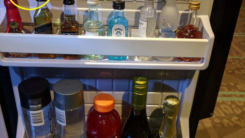 Na lodówce umieszczono informację ostrzegawczą. Jednak ulokowano ją za butelkami, małą czcionką, co utrudnia rozczytanie. Właściwie to nawet ciężko ją zauważyć. W dodatku wersja w języku angielskim umieszczona jest maksymalnie po lewej stronie, przez co nie rzuca się od razu w oczy. Turyści znający tylko ten język mogą łatwo narazić się na niepotrzebne koszta.