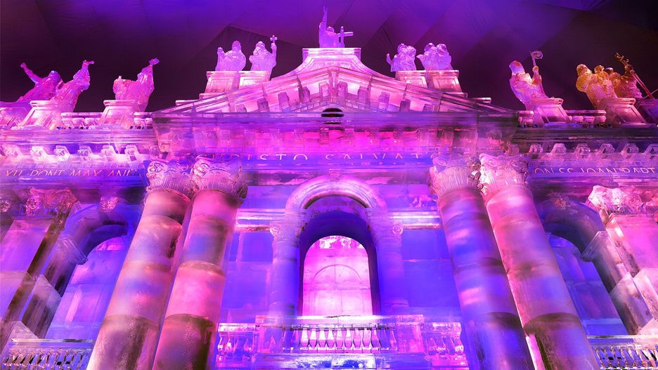 Do budowy użyto 1,8 tys. lodowych bloków, ważących łącznie aż 225 ton lodu. W środku podziwiać można portrety sześciu papieży i dzieła sztuki szklarza Achilleasa Sdoukosa. Budowa tego imponującego obiektu wymagała pracy 20 rzeźbiarzy z różnych krajów, w tym ze Słowacji, Polski, Niemiec i Czech, a głównym budowniczym był Adam Bakoš. Prace trwały przez pięć tygodni.