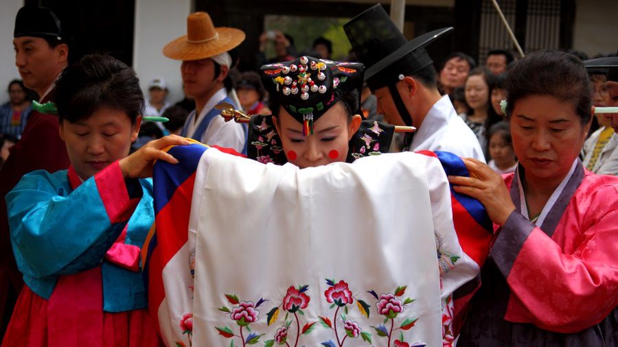 Obecnie większość młodych Koreańczyków, organizując swój ślub, podąża za zachodnimi wzorcami, jednak w niektórych regionach wciąż można natknąć się na tradycyjne ceremonie. Pierwszym krokiem do zawarcia małżeństwa jest podarowanie przez pana młodego matce swojej wybranki... dzikiej gęsi. Dawniej ptak był żywy, dziś zastępuje go figurka. Dzikie gęsi łączą się w pary na całe życie, prezent ma być zatem obietnicą wierności i troski, jaką mężczyzna otoczy małżonkę. Tradycyjnie ceremonia ślubna odbywa się w domu rodzinnym panny młodej. Para przypieczętowuje zawarcie związku, kłaniając się sobie i dzieląc się winem przygotowanym specjalnie na tę okazję. Piją z jednej czarki lub dwóch oddzielnych, ale wykonanych z jednej tykwy - symbolu połączenia dwóch części w jedność. Makijaż panny młodej jest bardzo delikatny, wyróżniają się jedynie trzy czerwone kółka, zdobiące policzki i czoło, które mają odstraszyć złe duchy.