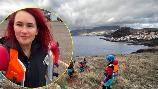 Po wysłuchaniu dokładnej instrukcji i wskazówek naszych przewodników, mijamy sznur zaparkowanych aut (wybrzeże Madery to jedno z najbardziej obleganych miejsc!), by zejść do wody. A raczej wskoczyć - z rękoma skrzyżowanymi na piersi – w niebieską toń pod nami. Plastikowa ochrona na piankę jest konieczna, gdy ślizgamy się po skałach, wspinamy na nie, skaczemy z nich, dopływamy do wyciągniętych przez instruktorów rąk.