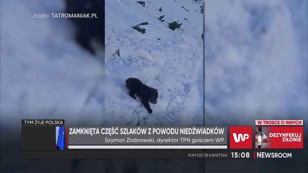 W często odwiedzanym przez turystów rejonie w Tatrach zamieszkała niedźwiedzica z dwoma niedźwiadkami. Jeden z nich wypadł z gawry bez mamy, zaliczając niebezpieczny zjazd z górki z lądowaniem na szlaku turystycznym. Sytuacja została nagrana przez świadka zdarzenia. Władze Tatrzańskiego Parku Narodowego zdecydowały się zamknąć dla turystów i narciarzy część szlaków w okolicy Czarnego Stawu Gąsienicowego. Chodzi o to, żeby niedźwiedzia rodzina miała spokój. "Apelujemy o zostawienie niedźwiedziej rodziny w spokoju i prosimy o zaufanie. Działamy w sposób profesjonalny" – mówi Szymon Ziobrowski, dyrektor TPN, który był gościem programu Newsroom WP.