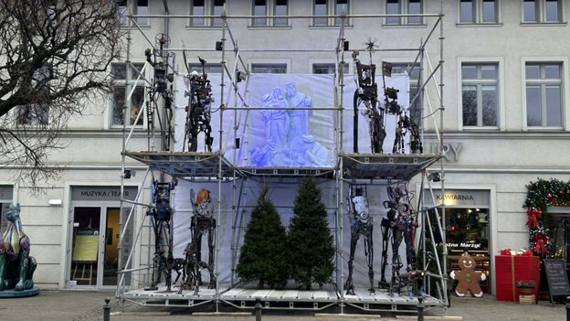 Autorzy tej nietypowej szopki wykorzystali elementy złomu do odtworzenia części ludzkich i zwierzęcych postaci. Jak wyjaśniają w rozmowie z PAP, postacie wykonane z metalowego recyklingu są celowo pokraczne, niepiękne, bo - jak zaznaczają - "taki jest dzisiejszy świat".