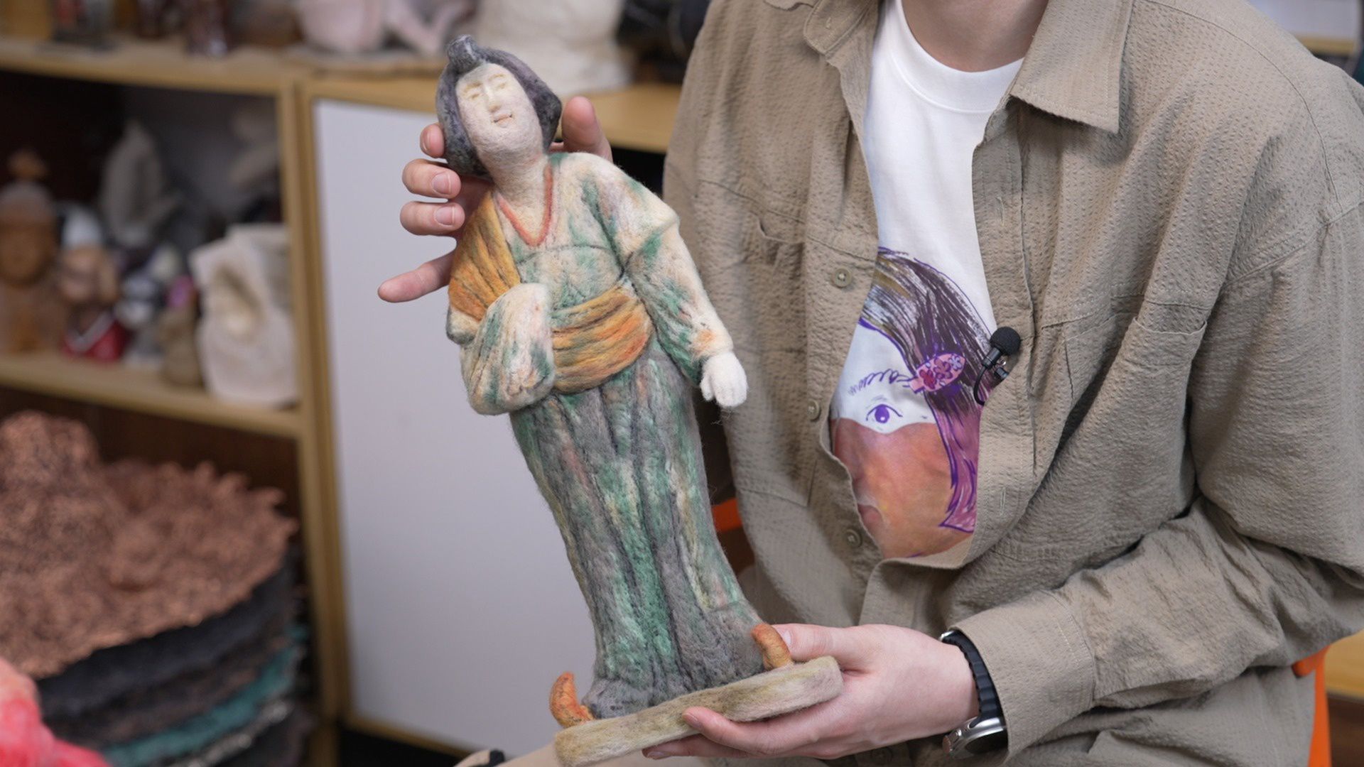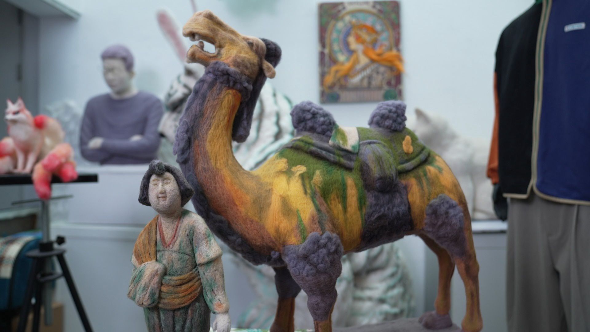 Najłatwiej jest użyć gliny, ponieważ można ją nałożyć bardzo szybko. Natomiast, aby uzyskać odpowiednią strukturę wełny muszę ją ugniatać igłą nawet dwa tysiące razy, zanim będzie naprawdę przylegać – opowiada nam artysta. Ten proces nazywa się filcowaniem i wymaga dużo czasu i cierpliwości. Zhang do tej pory wykonał z wełny ogromne mityczne bestie, charakterystyczne dla chińskiej mitologii. Oprócz tego stworzył serię imitacji zabytków dawnej chińskiej kultury, m.in. postać kobiety i figurę wielbłąda, dla których wzorem były prace ze słynnej ceramiki Sancai z czasów dynastii Tang oraz głowę buddy –replikę słynnej rzeźby z kamienia.