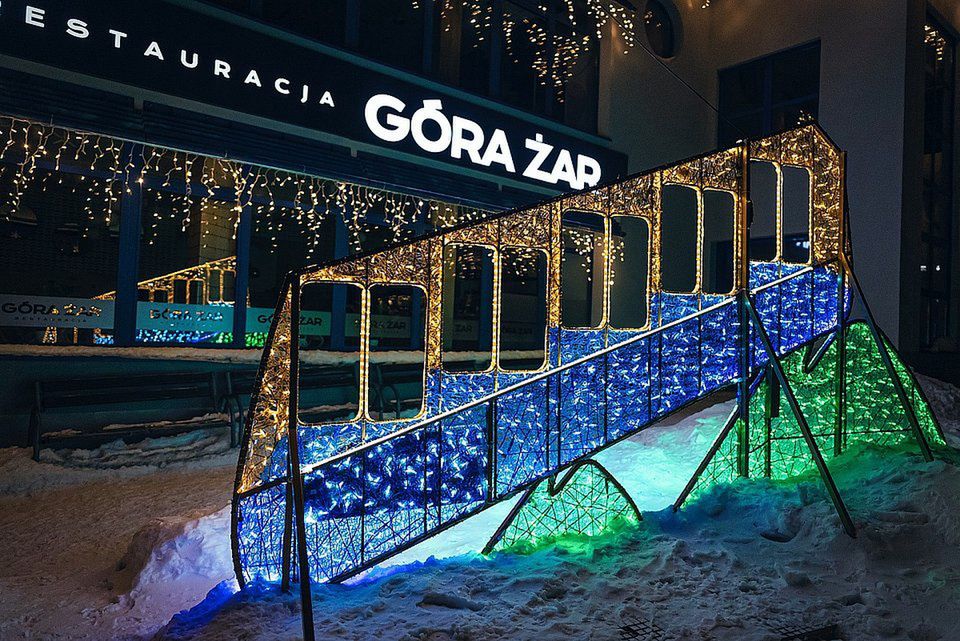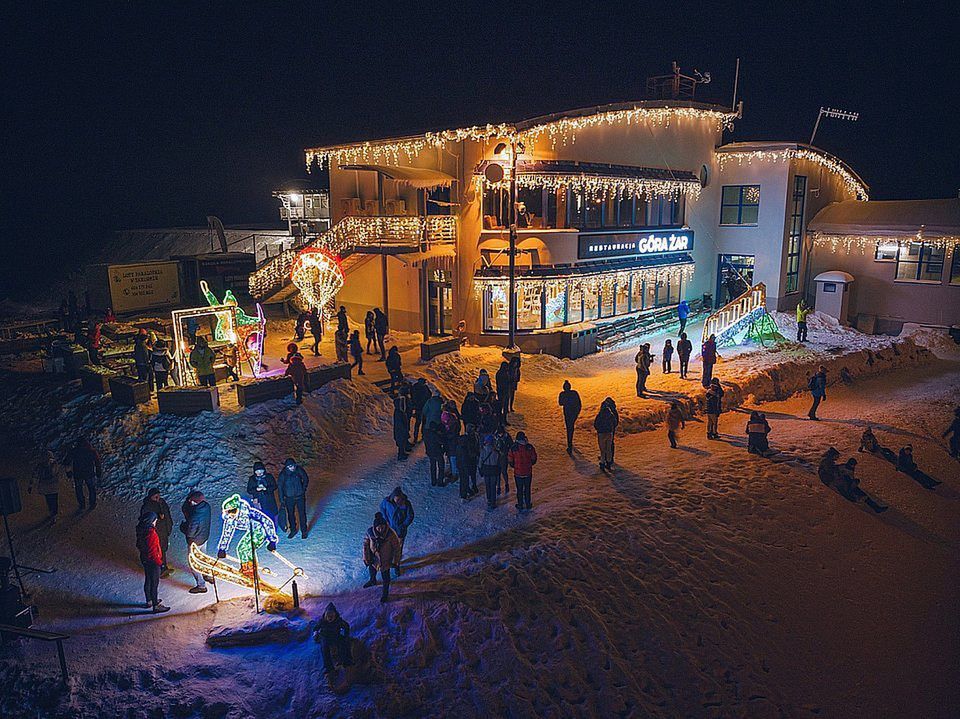 Krainę Żaru z lśniącymi rzeźbami świetlnymi możemy odwiedzać od godz. 15:00 codziennie do 2 marca. Iluminacje nawiązują do głównych żywiołów obecnych na szczycie. Znajdziemy m.in. świetlistą paralotnię, szybowiec czy szusującego narciarza, a także wagonik i migoczące iluminacje choinek, które tworzą niezwykły klimat.