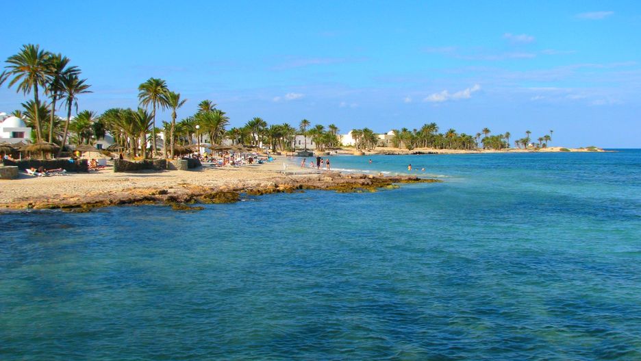 Wyspa leży w zatoce Mała Syrta, ale najpiękniejsze plaże znajdują się od strony Morza Śródziemnego - na wybrzeżu wschodnim i północno-wschodnim. 20-kilometrowy pas oferuje liczne luksusowe hotele, kasyno, pole golfowe oraz doskonałe możliwości do uprawiania sportów wodnych.