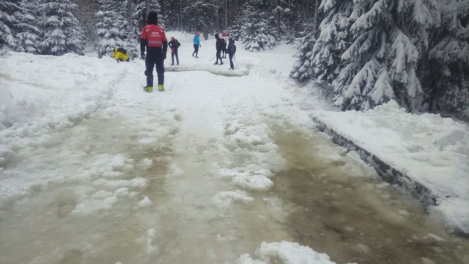 "Po intensywnych opadach śniegu połączonych z silnym wiatrem zablokowany został przepust pod niebieskim szlakiem na Białym Potoku przed Kozim Mostkiem na Łomnicy. Spiętrzona woda przepływa górą i tworzy, niemożliwe do ominięcia suchą nogą, kilkumetrowe lodowe koryto" - informują goprowcy.