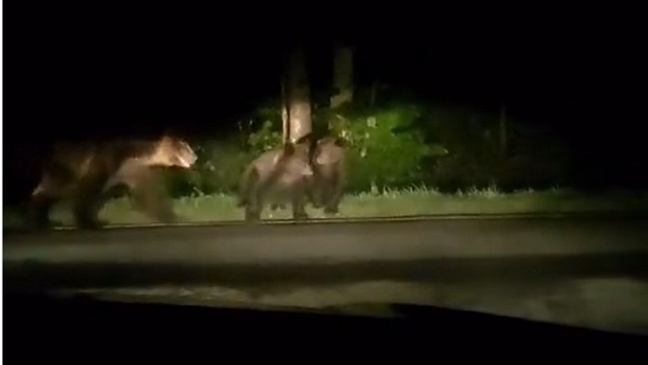 Na nagraniu, które zarejestrował patrol SG widać dwa mniejsze i jednego dużego niedźwiedzia. Przechadzają się drogą i nic sobie nie robią z tego, że ktoś świeci w ich kierunku.