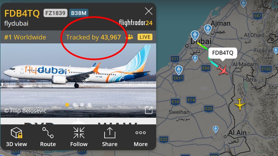 Zaplanowany na godzinę 15:35 czasu lokalnego (12:35 czasu polskiego) lot z Dubaju do Warszawy linii Flydubai wystartował z ponad 3-godzinnym opóźnieniem. Na stronie Flightradar24 śledzi go ponad 40 tys. osób. W momencie startu był numerem jeden wśród najliczniej śledzonych lotów.