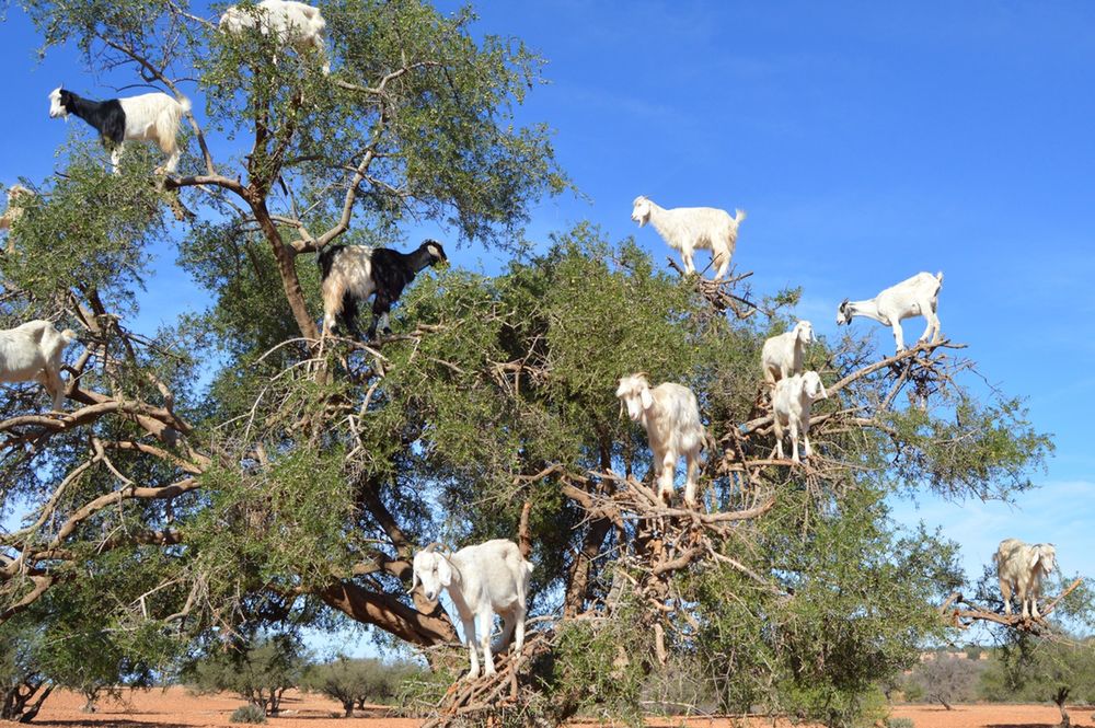 Choć wydają się nierealne, obrazki prezentujące kozy, które niczym wrony obsiadają drzewa, są w Maroku codziennością. Rośliny, które upodobały sobie te rogate ssaki, to argania żelazna. Jest to gatunek endemiczny, występujący jedynie na południowym zachodzie kraju. Jego uprawa nie udała się w żadnym innym miejscu na ziemi. Kozy wschodzą na drzewa, by zjadać jego listki i owoce, z których na co dzień otrzymuje się cenny olej wykorzystywany w lecznictwie i kosmetyce.