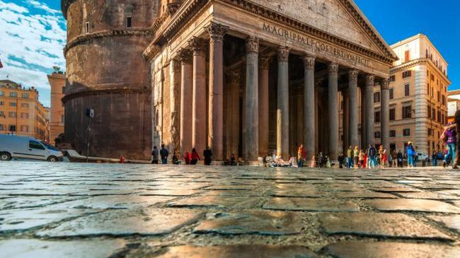 Panteon był największą budowlą kopułową na świecie przez około 1300 lat, aż do XV w. Dziś to jedna z najwspanialszych i najlepiej zachowanych budowli *z czasów starożytnego *Rzymu. Ten okazały gmach powstał w II w. n.e. za panowania cesarza Hadriana jako świątynia pogańska poświęcona wszystkim bogom. Budynek Panteonu, znajdujący się na Polu Marsowym, jest przykładem doskonałości i harmonii architektury starożytnej (zbudowano go na planie koła, a wysokość budynku równa jest jego średnicy). Ponad 40-metrowa średnica kopuły jest rozwiązaniem, na którym przez wiele wieków wzorowali się nawet architekci ery nowożytnej. Ciekawym rozwiązaniem architektonicznym jest oświetlenie. Jedynym źródłem światła jest bowiem otwór w dachu o średnicy 9 m. Taki sposób iluminacji wnętrza przyniósł niezwykle ciekawe efekty wizualne.