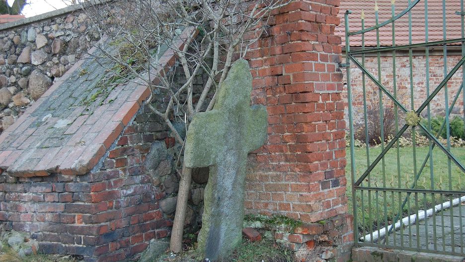 Taki trójzębny ryt widnieje na krzyżu pokutnym w Małujowicach koło Brzegu. Datowany na XIV-XVI w. świadek historii z utrąconym prawym ramieniem stoi przy wewnętrznej stronie kościelnego muru. Wedle legendy, postawił go zabójca, którego była narzeczona zmieniła zdanie i wyszła za mąż za innego. Kiedy kondukt weselny zmierzał do kościoła, wyrósł przed nim jak spod ziemi oszalały z zazdrości zalotnik i, niewiele myśląc, przeszył niedoszłą żonę widłami.