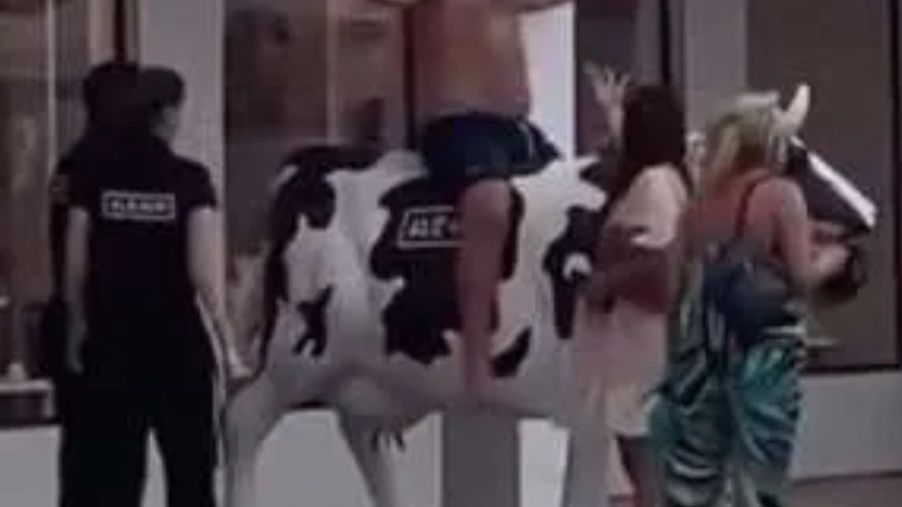 Pracownicy sklepu podbiegli w ciągu kilku sekund, nie tylko po to, aby stamtąd usunąć mężczyznę, ale także aby powstrzymać coś, co wyglądało na nieudolną próbę uprowadzenia krowy. W dziwacznej scenie pracownicy, porównani do "Don Kichota i Sancho Pansy", zatrzymali grupę, która próbowała manewrować krową po ulicy.