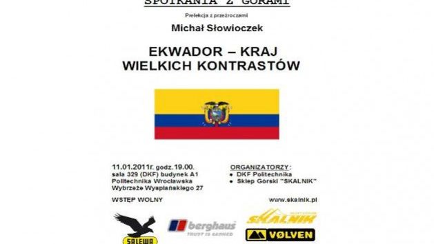 Na kolejne Spotkania z Górami zapraszamy już 11.01.2011 o godzinie 19.00. Gościem będzie Michał Słowioczek, który przedstawi prelekcję pod tytułem: "Ekwador - Kraj wielkich kontrastów".