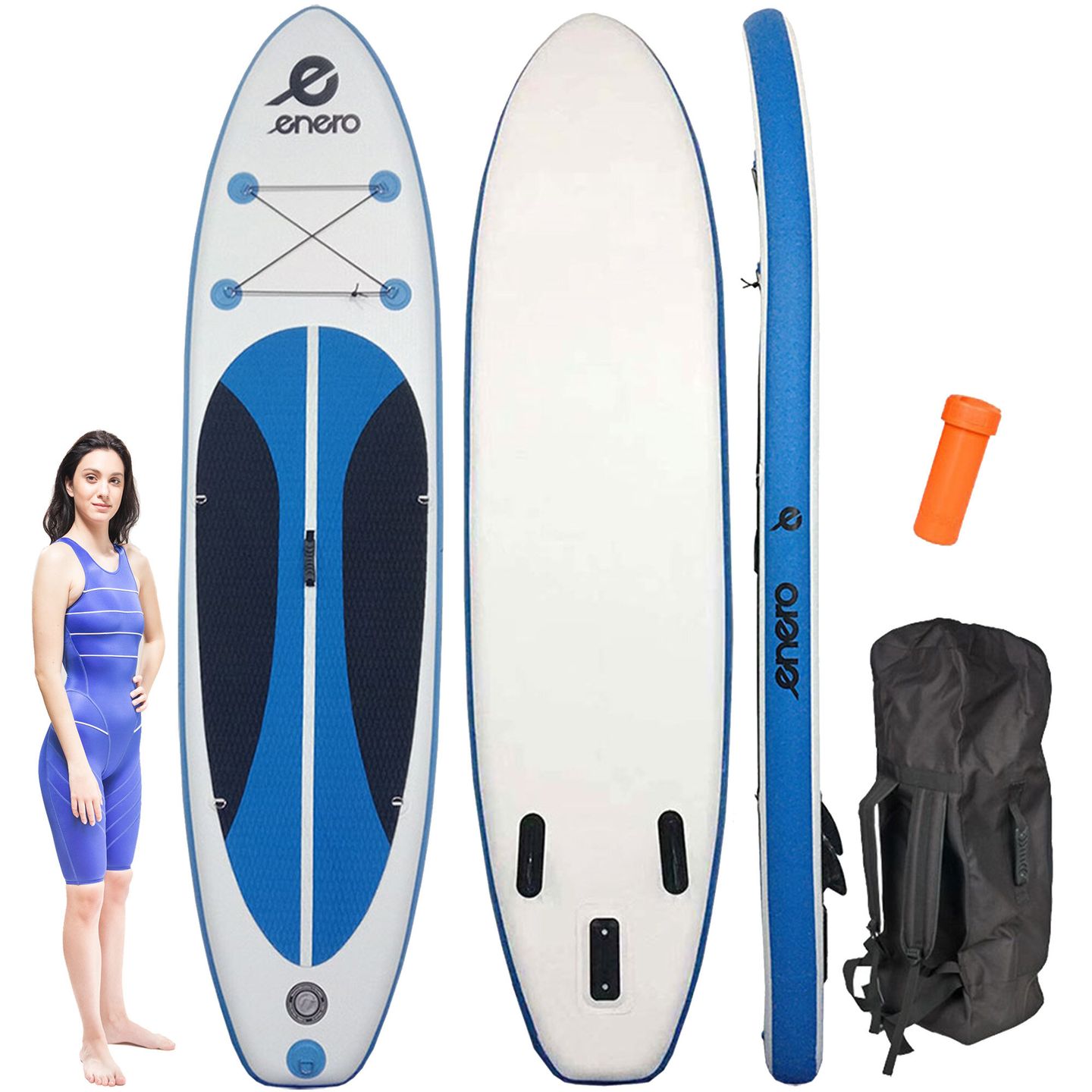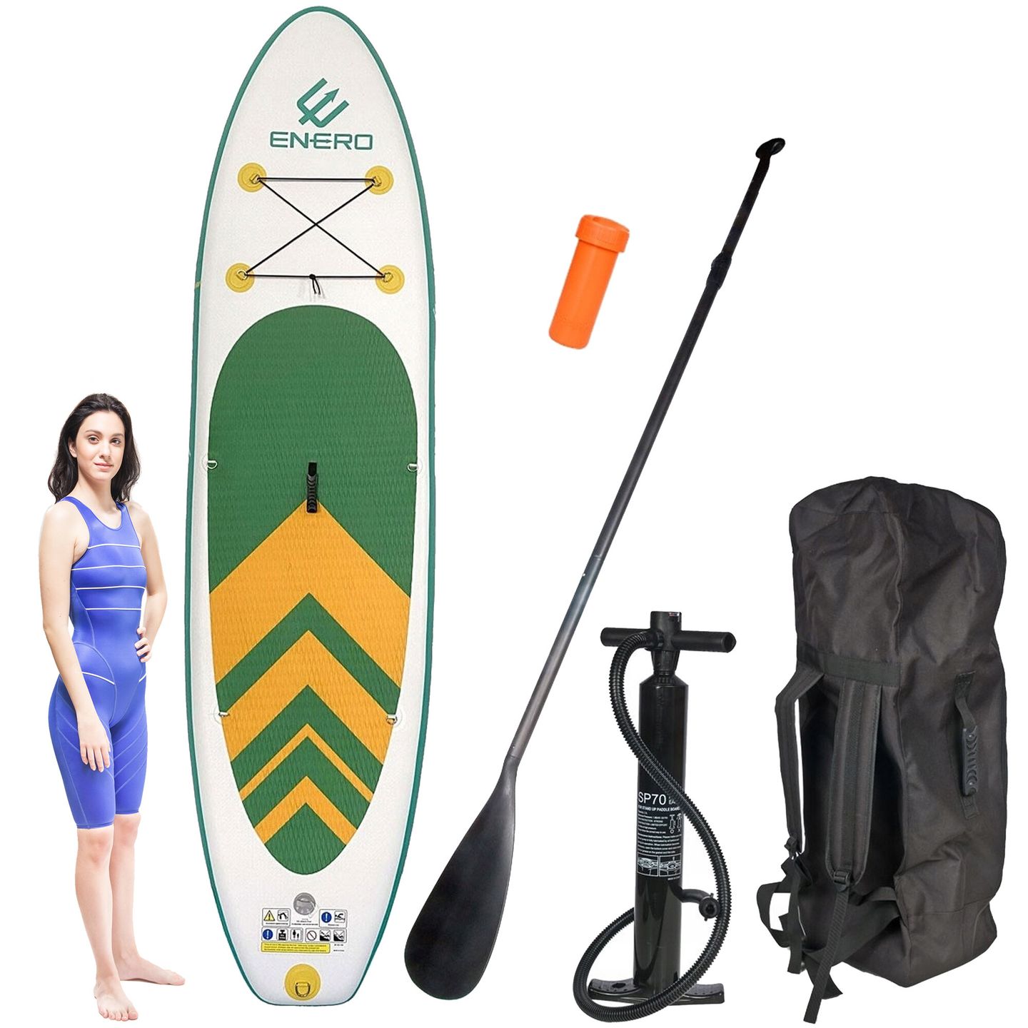 Spójrz tylko na ten zestaw. Prezentowana deska SUP Enero ma długość 300 centymetrów i 76 centymetrów szerokości. To dobry model dla początkujących i nie tylko. Po napompowaniu, deska jest sztywna i ma grubość 15 centymetrów. Maksymalne obciążenie wynosi 135 kilogramów. Jest to więc naprawdę sporo! Deska waży 7,4 kilograma. Możesz ją wygodnie przenosić w torbie, którą będziesz nosił na plecach. W zestawie znajduje się pompka nożna, płetwa, zestaw naprawczy i wiosło. Deskę z akcesoriami kupisz w naprawdę dobrej cenie. Za całość zapłacisz zaledwie 1200 złotych!
