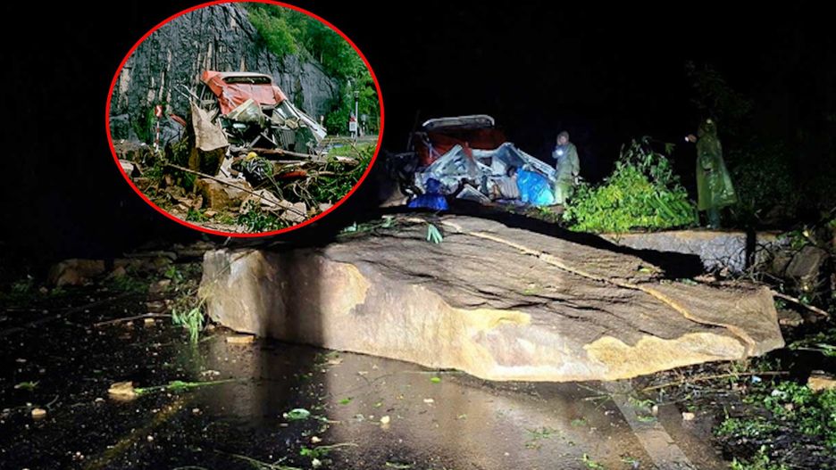 W niedzielny wieczór masy ziemi i skał upadły na autokar przewożący 32 osoby.