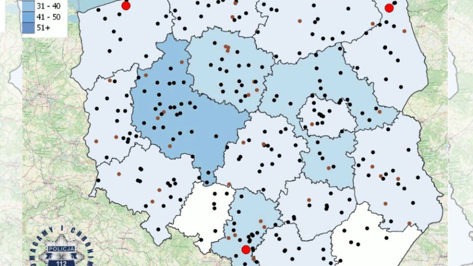 W czasie tegorocznych wakacji łącznie na polskich drogach doszło do 292 wypadków ze skutkami śmiertelnymi. Każdy z nich zaznaczony jest punktem na mapie naszego kraju, dostępnej na stronie policji. Czarne kropki oznaczają wypadki ze skutkiem śmiertelnym, bordowe - te, w których osoba zmarła w okresie 30 dni od zdarzenia. Z kolei pulsujące na czerwono i żółto większe punkty to tragedie, mające miejsce w czasie ostatniej doby. Wypadki przedstawiane są też za pomocą innych znaków graficznych. Czarne kropki zastępują żółte, trójkątne znaki ostrzegawcze, zaś bordowe punkty - czerwone trójkąty.