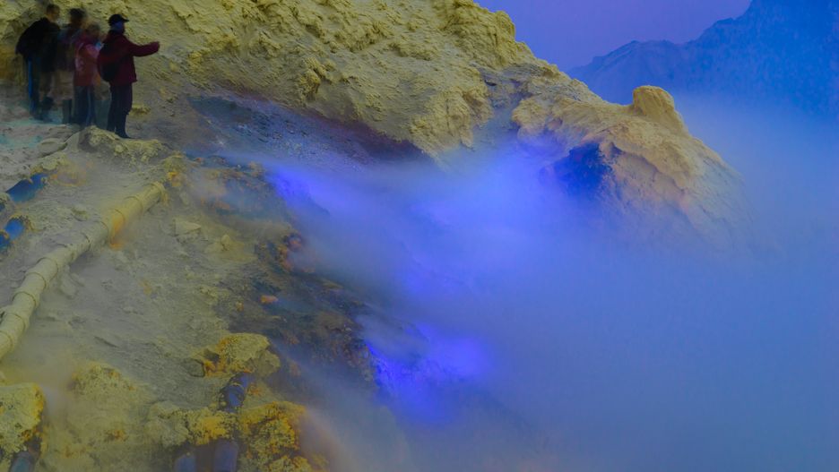 Para wspięła się na szczyt aktywnego wulkanu, aby zobaczyć z niego wschód słońca i zrobić sobie zdjęcie na tle niebieskiego ognia. Jest to zjawisko, które występuje w wyniku spalania gazów siarkowych.