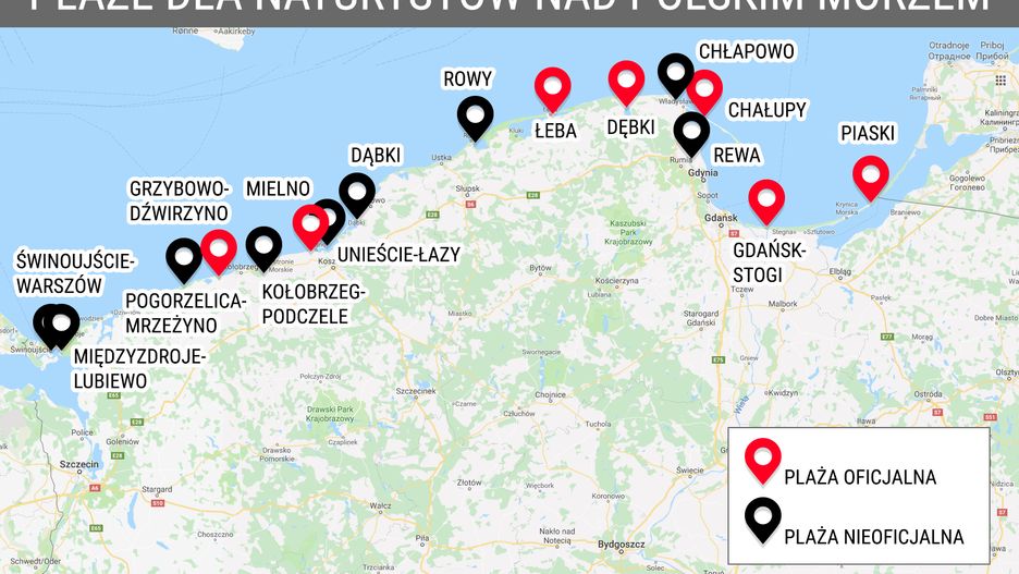 Na razie jednak popularne plaże dla nudystów nad polskim morzem - m.in. w Rewie, Świnoujściu, Międzyzdrojach (Lublewo), Kołobrzegu (Podczele), Rowach i wiele innych - wciąż czekają na nadanie im oficjalnego statusu naturystycznych plaż.