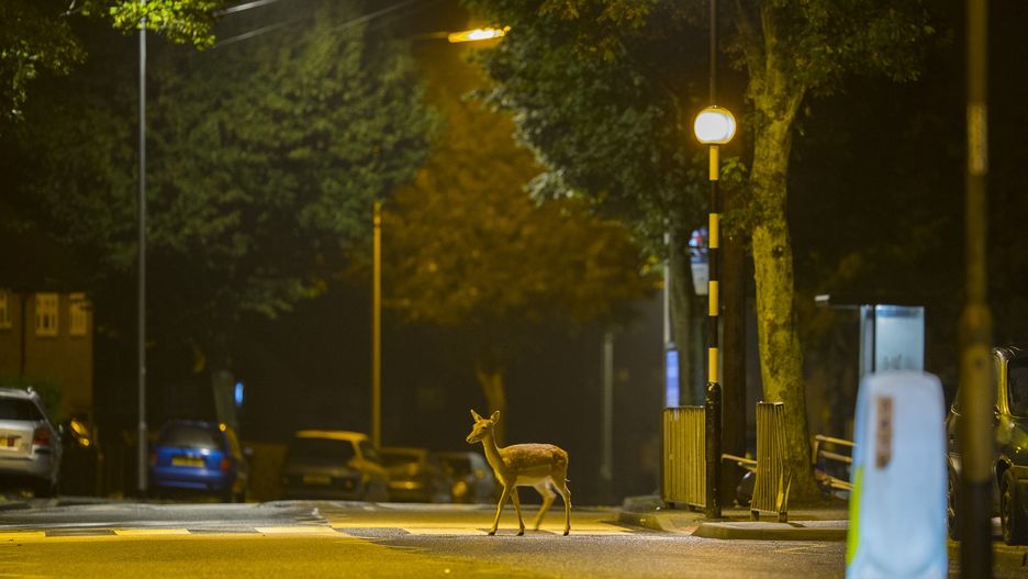 Przed minięciem środka jezdni ponownie zerka w prawo. Kierowcy czekają aż zwierzę bezpiecznie przejdzie na drugą stronę ulicy, po czym odjeżdżają, a łania, będąc już poza pasami, przyspiesza.