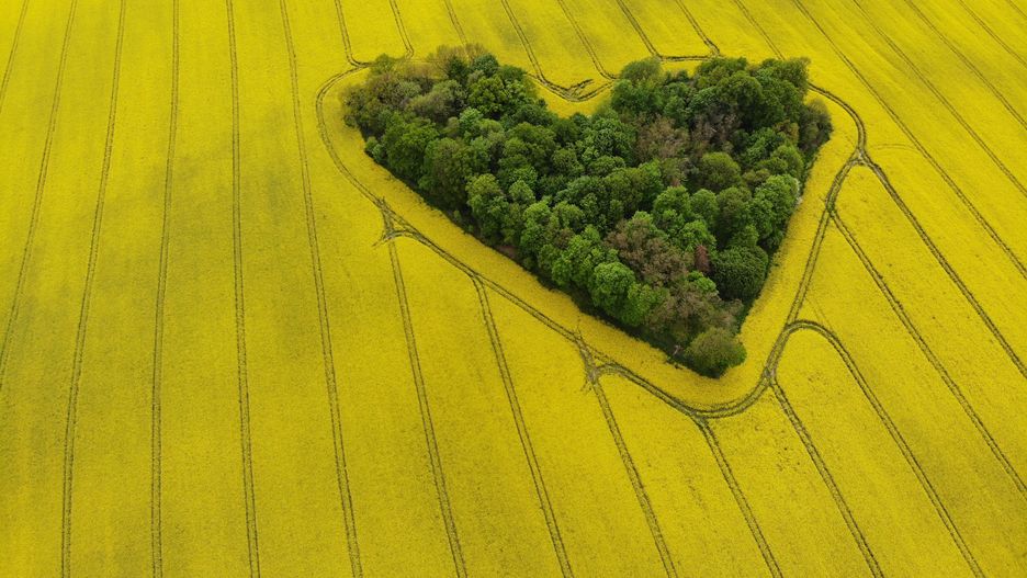 Wyjątkowo magiczny krajobraz tworzy zielone skupisko drzew układające się w kształt serca. Otoczone jest przez pola, które wiosną, dzięki kwitnącemu rzepakowi wyglądają jak żółty dywan. Intensywne barwy kontrastują ze sobą, co wygląda jeszcze bardziej imponująco.